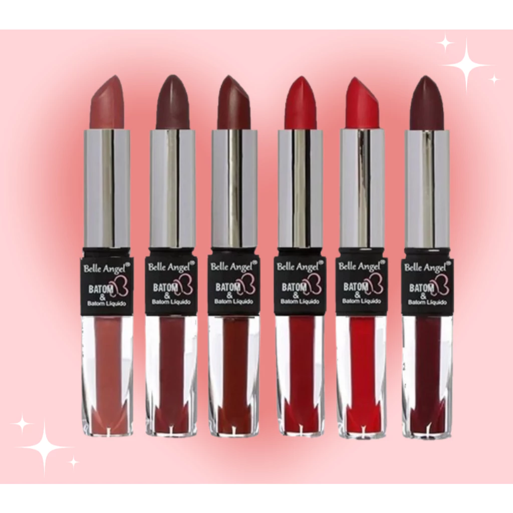 Batom 2 em 1 Belle Angel com batom em bastão e líquido matte. Alta fixação, textura macia e praticidade em um único produto. Compre na ZapMake!